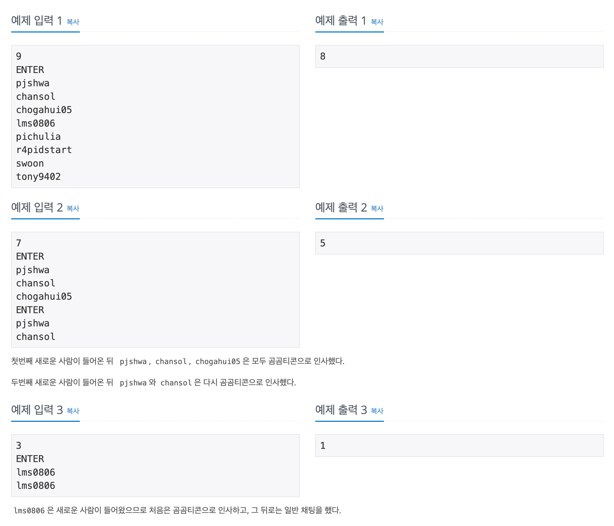 ๋ ๋ฒ์งธ ์ค๋ถํฐ ๊ฐ์ ์ค์ ๊ฑธ์ณ ์๋ก์ด ์ฌ๋์ ์ ์ฅ์ ๋ํ๋ด๋ ENTER, ํน์ ์ฑํ ์ ์ ๋ ฅํ ์ ์ ์ ๋๋ค์์ด ๋ฌธ์์ด๋ก ์ฃผ์ด์ง๋ค.